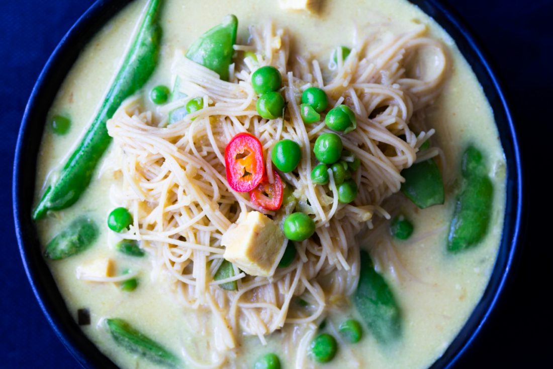 - Add the lime and curry leaves, spices, chilli, tamari, coconut milk, water, salt, tempeh, sugar snap peas and frozen peas. Allow the curry to cook for 10-15 minutes to let the flavours develop.